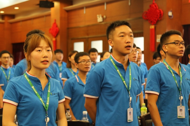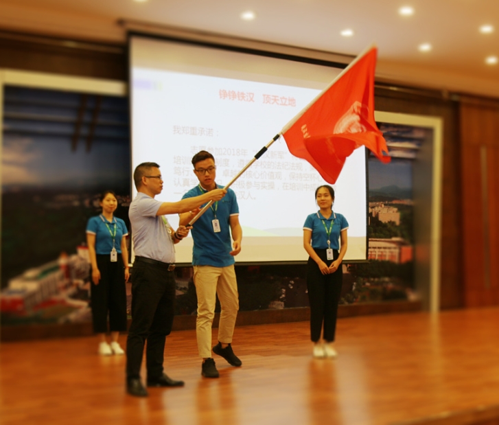 接下來,新學員代表上臺宣誓并簽署誓詞,承諾嚴格遵守培訓要求、秉承鐵漢核心價值觀,認真學習、積極參與,在培訓中自我成長。樊杜平接過新學員簽署的承諾書并授旗,與全體參會人員及學員齊唱《鐵漢之歌》。